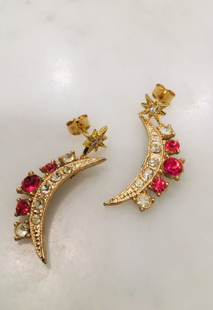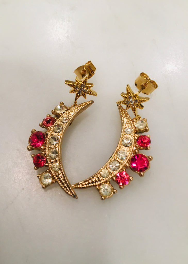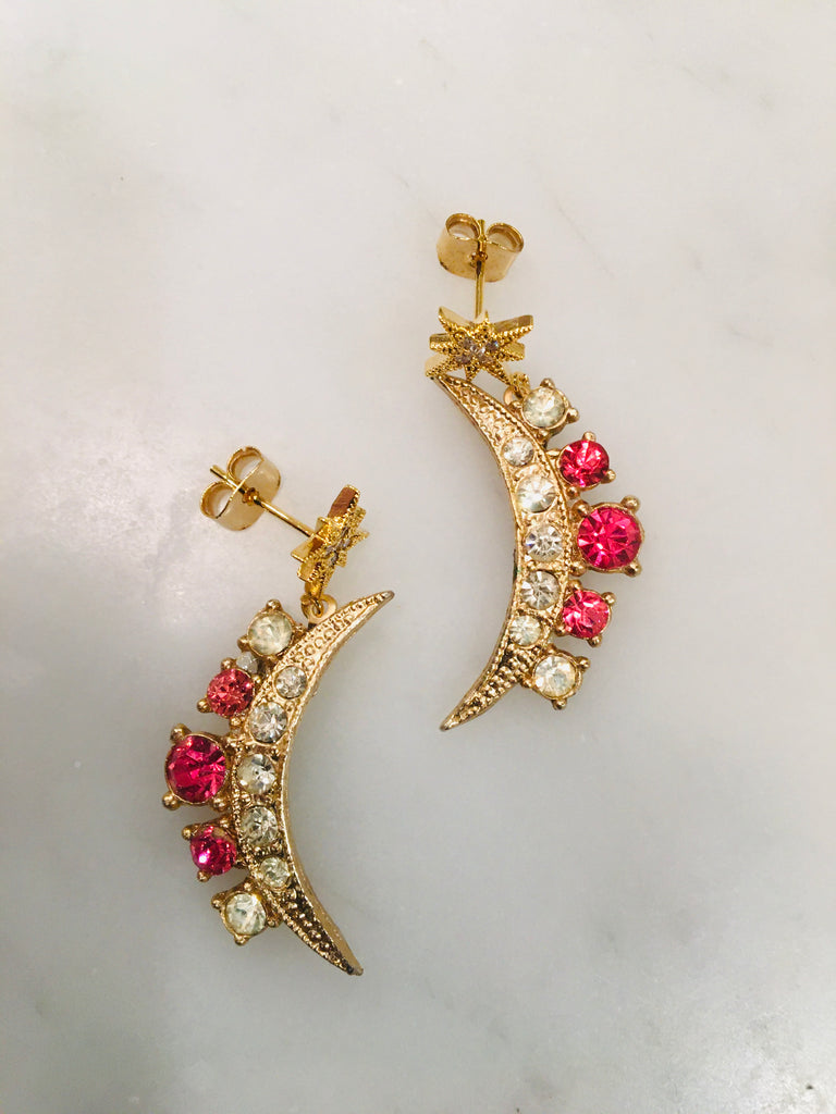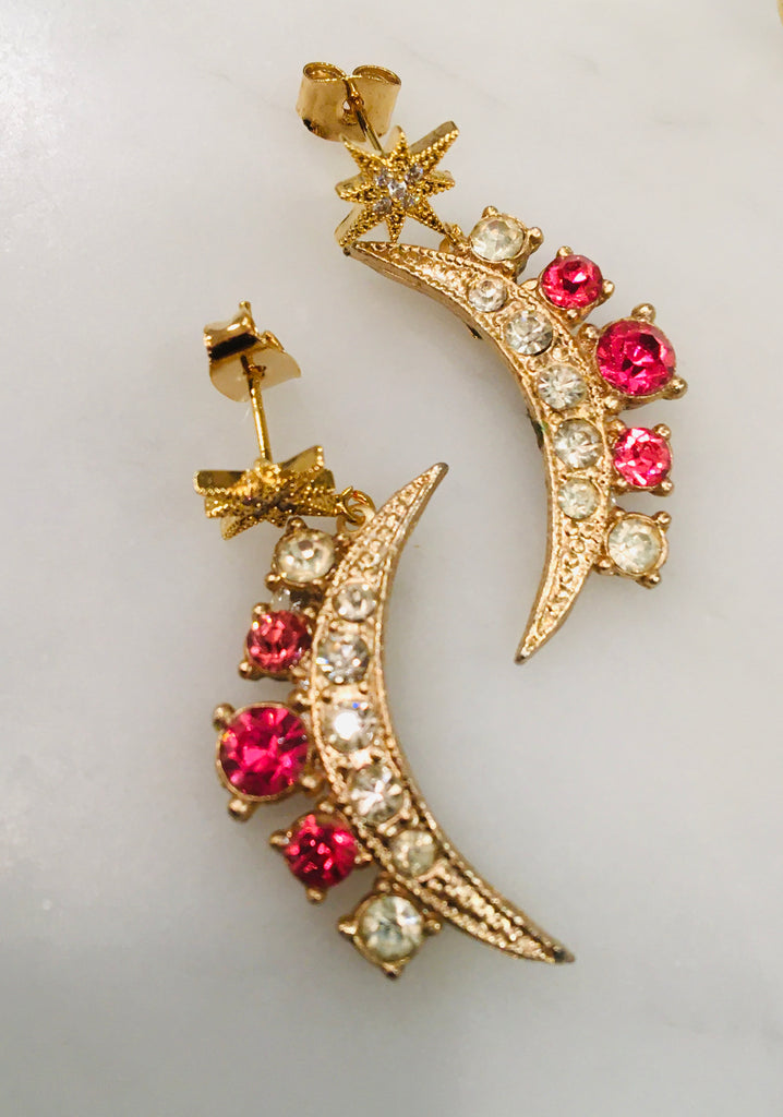 Currently my favorite earrings. Thin slivers of crescent moons studded with pink and clear rhinestones are perfect for all your celestial moments. Vintage 1950s earrings, originally screwback, are now set on sterling silver and 22ct gold starburst posts. Only one pair of course. Total length 1.5”