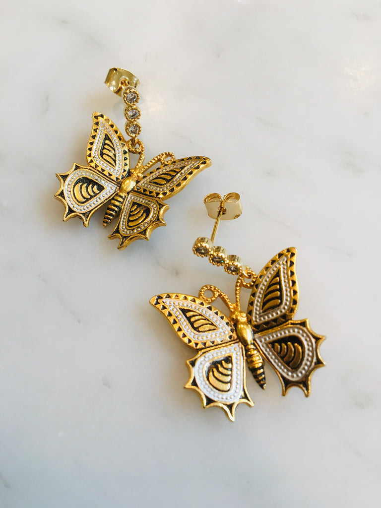 Spanish Damascene butterfly earrings circa 1940s are gorgeously updated with 22ct gold posts set with CZ. Originally, these incredibly light weight earrings were screwback, but now can be comfortably worn. Delicate enamel etching characterizes the damascene style. I” in diameter, 1.25” total drop.