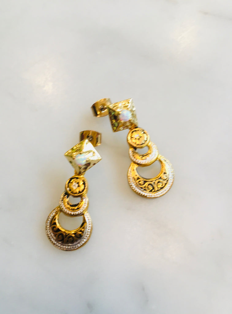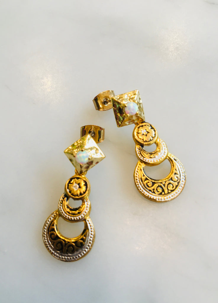 Gorgeous Art Deco earrings circa 1920s in a stacked crescent design are etched in damascene style with enamel. Set on 22ct gold vermeil posts with opal these are elegant delicate one of a kind earrings. 1” in total drop.