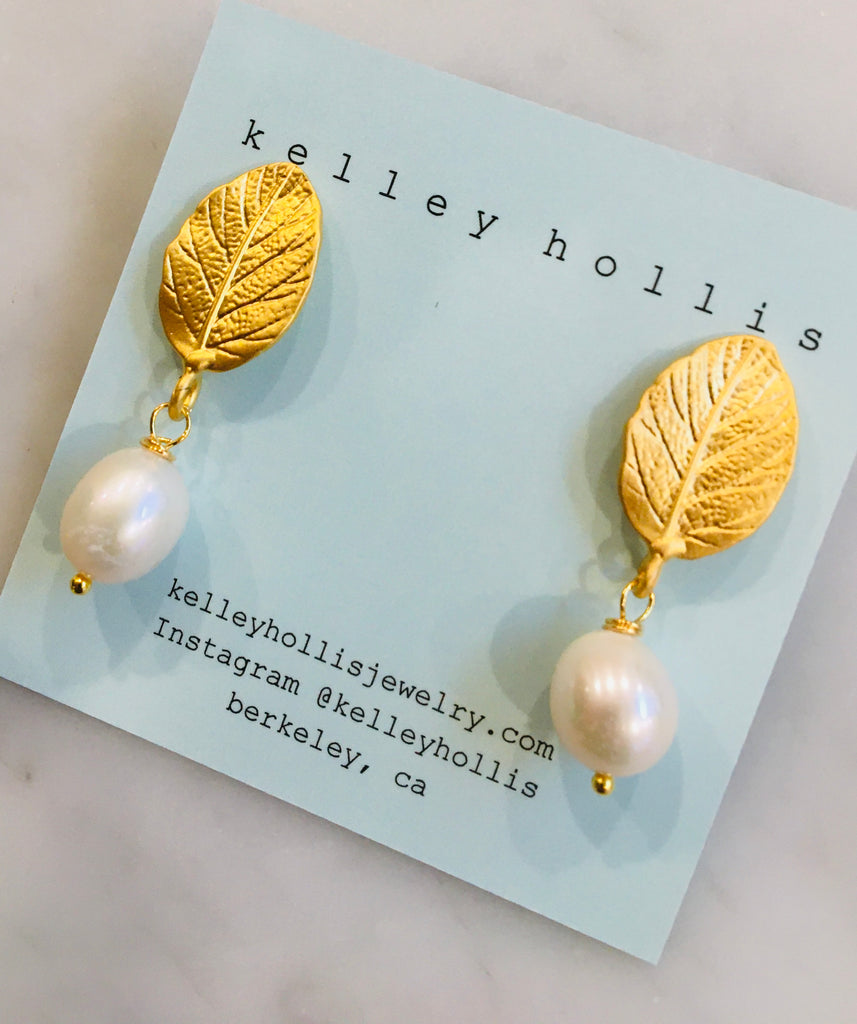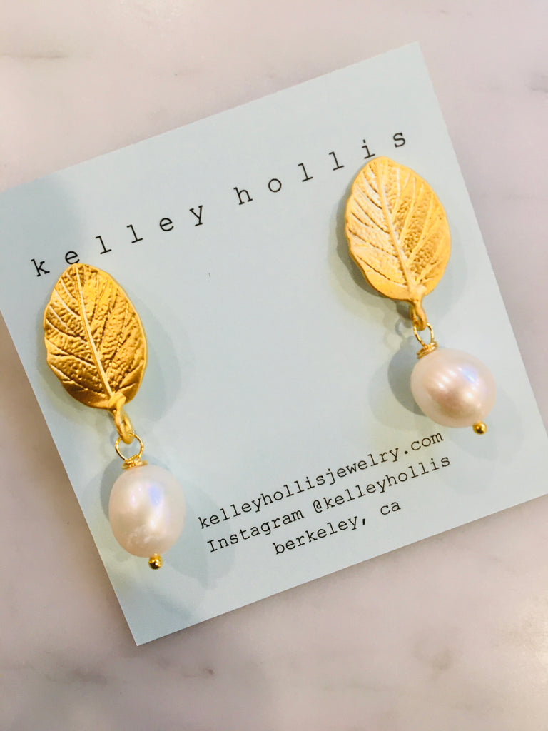 Stunning gold leaves drop beautiful natural baroque pearls. Pearls are 11mm in length in gorgeous natural crea, leaves 22ct gold over silver. Total drop 1.25.” Perfect for pairing with Golden Leaf Necklace.