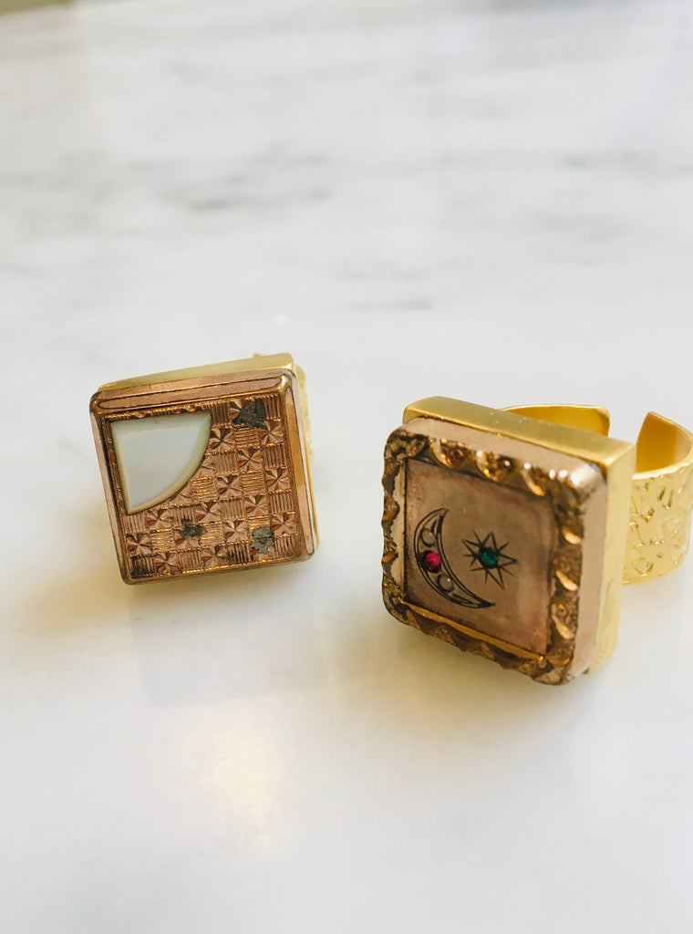 Stunning 18mm square vintage ring set in 22ct gold vermeil setting. Fully adjustable band. Ring is created from an art deco cufflink circa 1920s. Etched design with mother of pearl setting.
