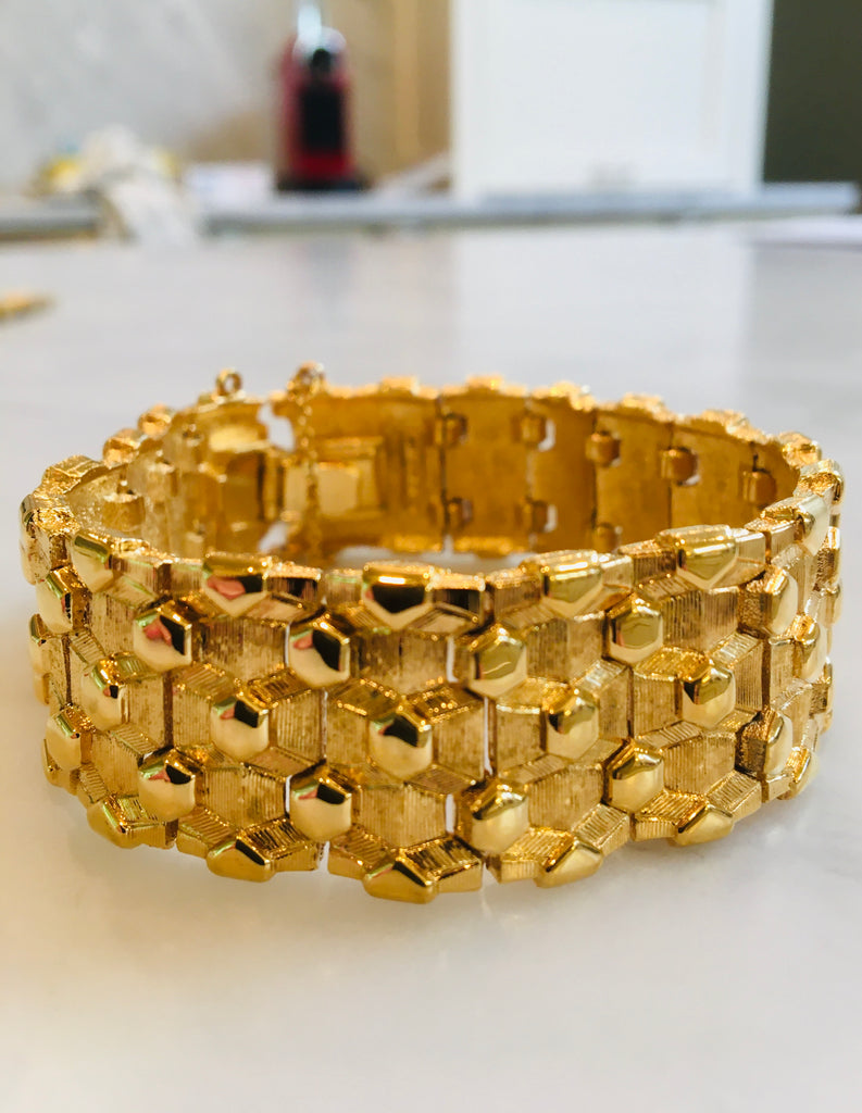 Stunning gold honeycomb link bracelet 1” in diameter. Bracelet has gorgeously detailed honeycomb links for a stunning drape and sinuous movement on the wrist. Circa 1950s, amazing vintage condition. Set with new 22ct gold safety clasp. 7.25” total length. Secure latch clasp.