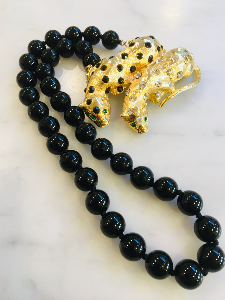 Two gorgeous paired leopards circa 1950s. One leopard with black crystal spots the other with clear, and both with glimmering emerald green eyes. Leopards are 2” by 3” in width. Set with 18” hand knotted onyx beads. This necklace has a double clasp so that the beads can be removed to wear leopards as a beautiful coat brooch.