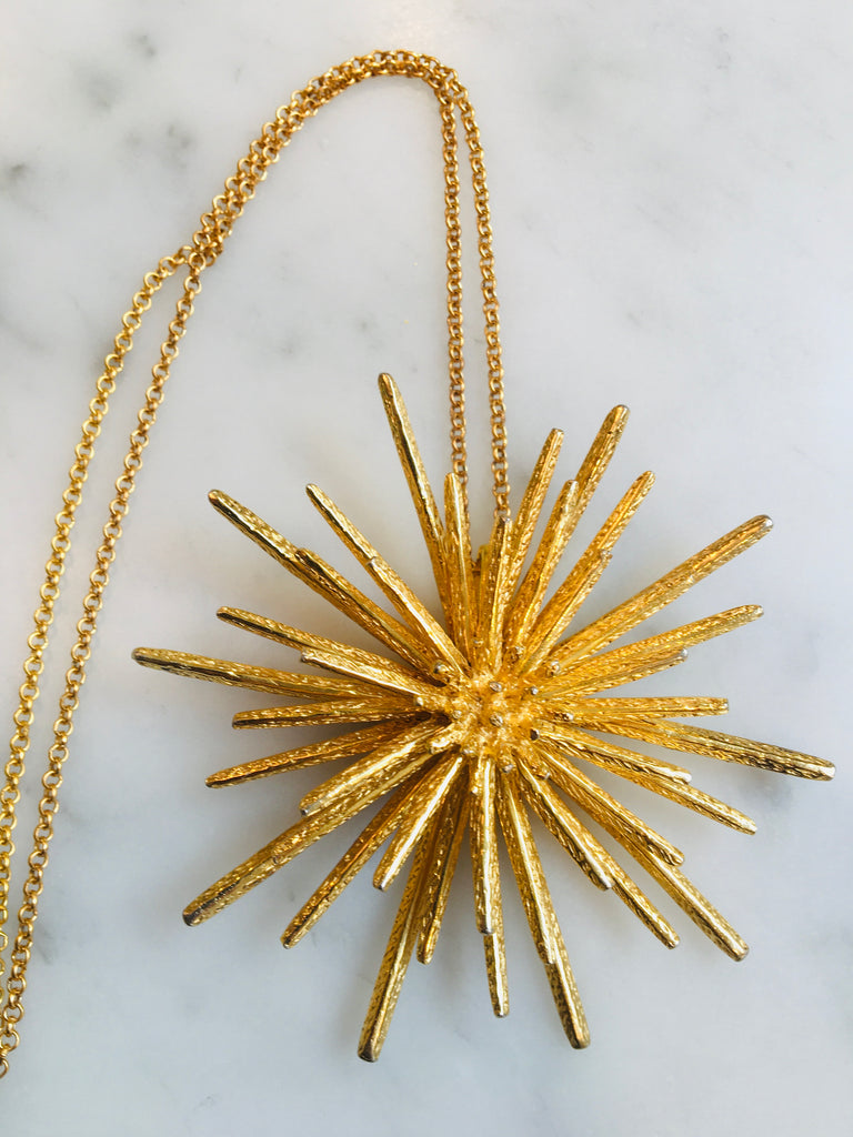 Fabulous midcentury statement necklace. This brutalist style atomic starburst is truly stunning. 2.5” in diameter with multi layers of this incredible textured piece will garner lots of attention. Set on 22ct gold vermeil chain.
